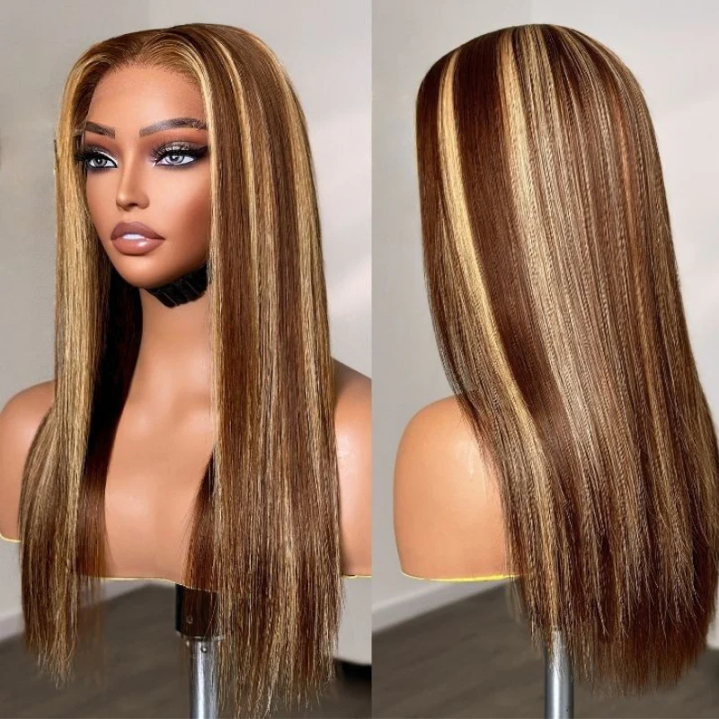 Honey Blonde Highlight Wig Straight Glueless Put On and Go Lace Front Human Hair Wigs 180% Density